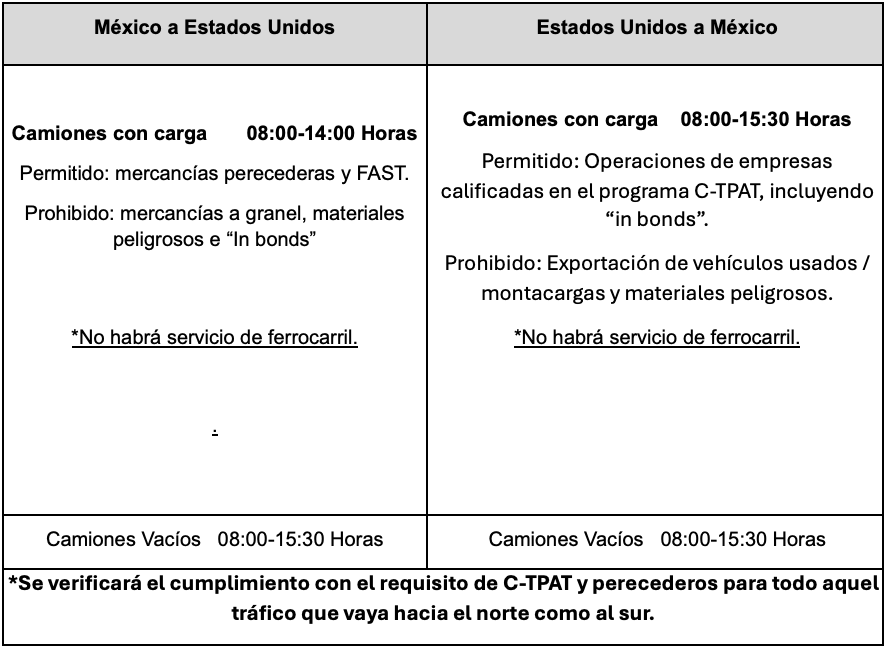 En seguimiento al comunicado oficial emitido por la autoridad americana (CBP), te compartimos los horarios de operación establecidos para la aduana de Otay Mesa el próximo 27 de noviembre de 2025. Esta información tiene como finalidad apoyarte en la planeación estratégica de tus operaciones y garantizar el cumplimiento de los lineamientos durante este periodo.