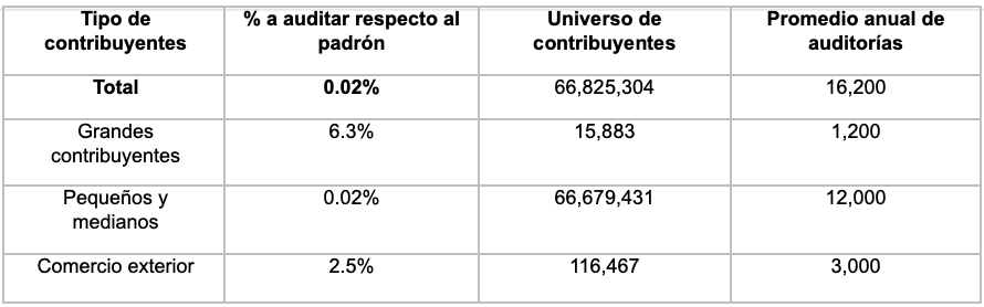 Para el ejercicio 2026, se prevé auditar un 0.02% del padrón nacional, equivalente a 16,200 contribuyentes.